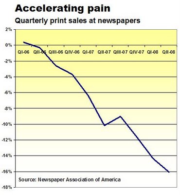 Alan Mutter dari Reflections of a Newsosaur mengatakan, penurunan ini sudah terjadi selama sembilan kuartal sebelumnya selama berturut-turut (lihat grafik). Selain surat kabar, media-media online juga mengalami penurunan pendapatan iklan. Namun tidak separah yang dialami media tradisional itu.